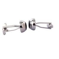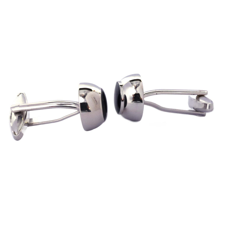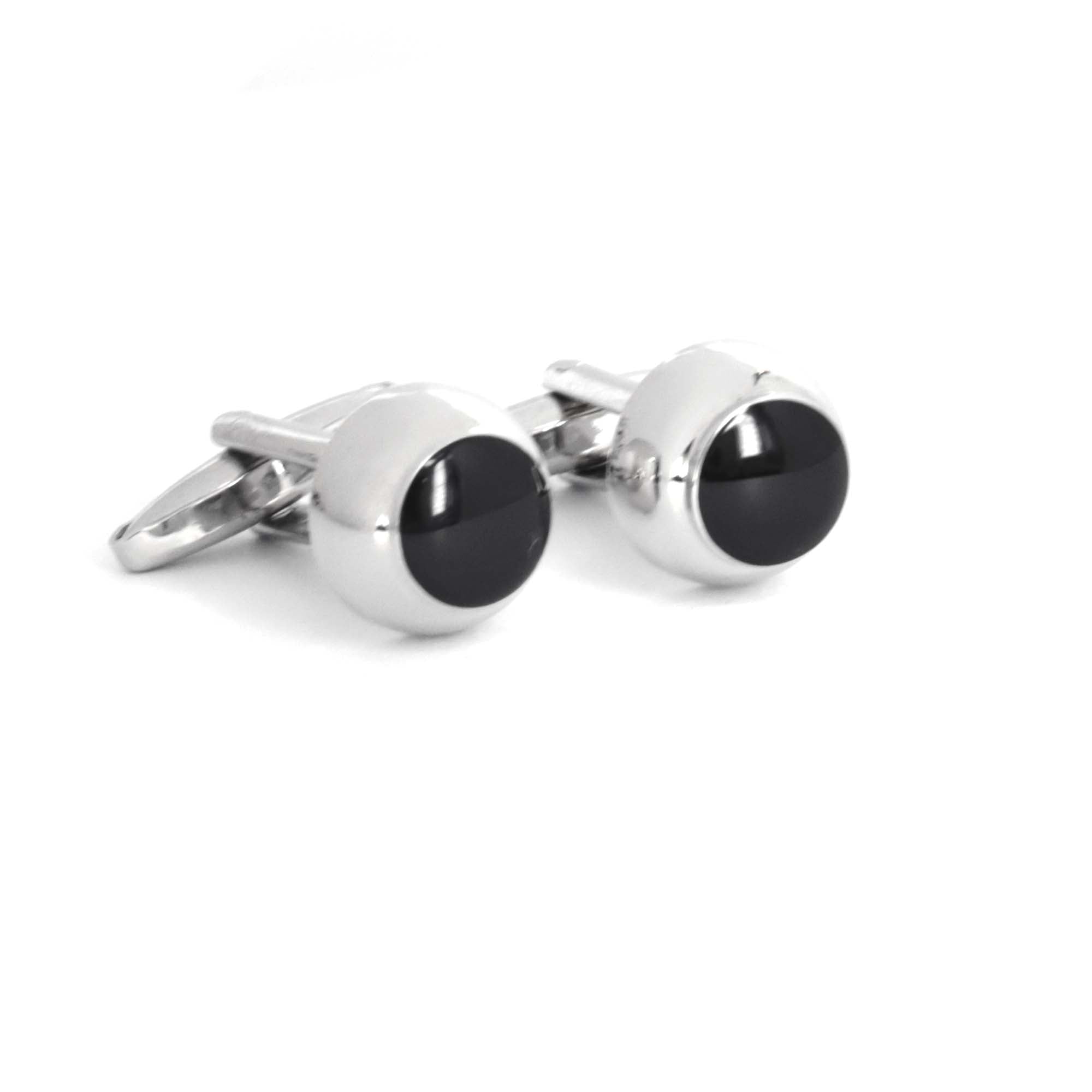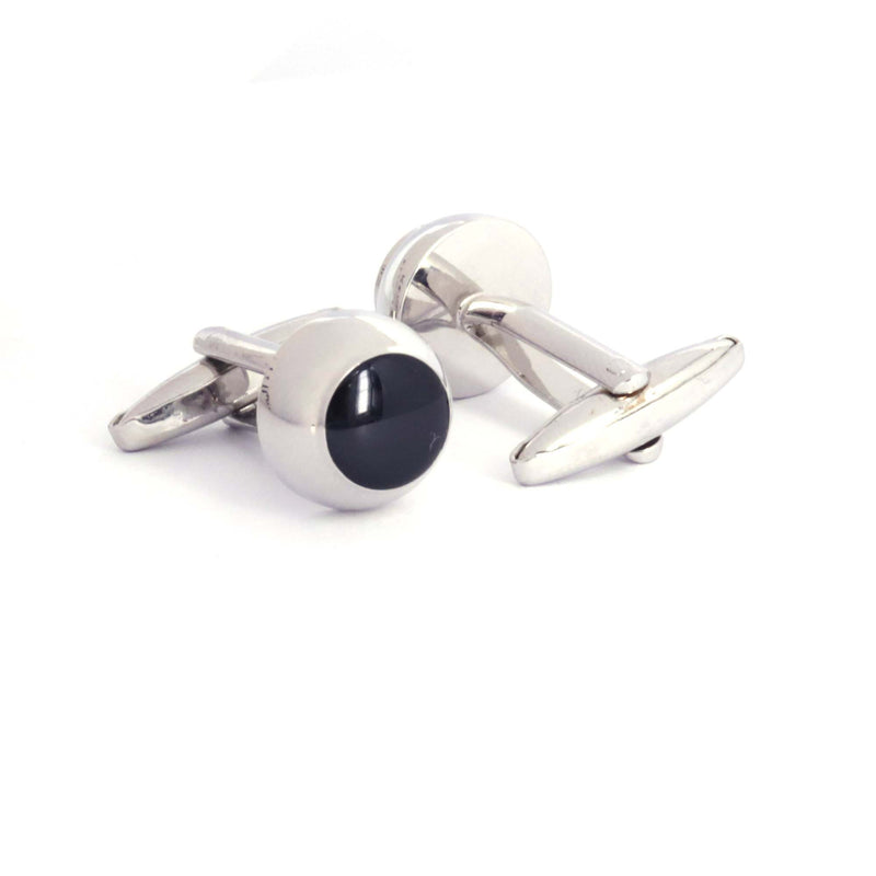 These Mini size Silver Round Cufflinks feature a stylish black enamel background encased by a 12.9 mm silver dot surround. Perfect for adding a touch of contemporary flair to your formal ensemble.